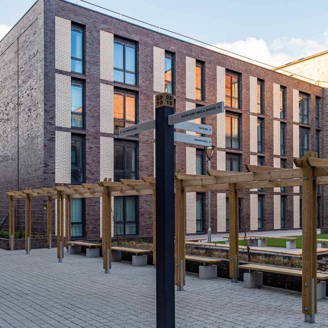 Outcome: The Goodsyard is a mixed-use residential and commercial development. The site is made up of 395 residential units, located in 4 blocks: Great Western, Inward Shed, Top Shed and Outward Shed. The Goodsyard showcases a harmonious wayfinding scheme of strong design intent, complex technical manufacturing, an array of different materials used and bespoke finishes.
